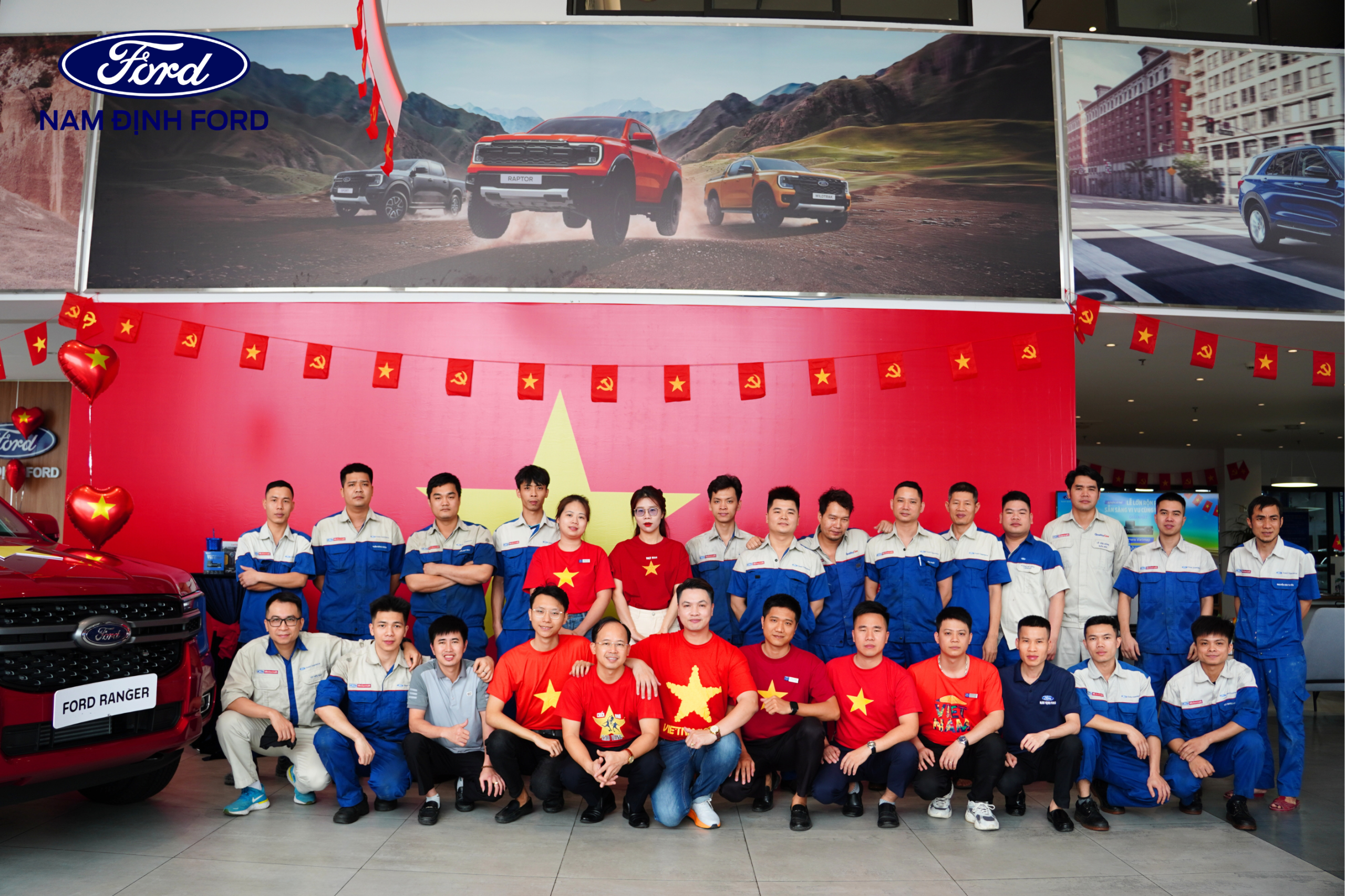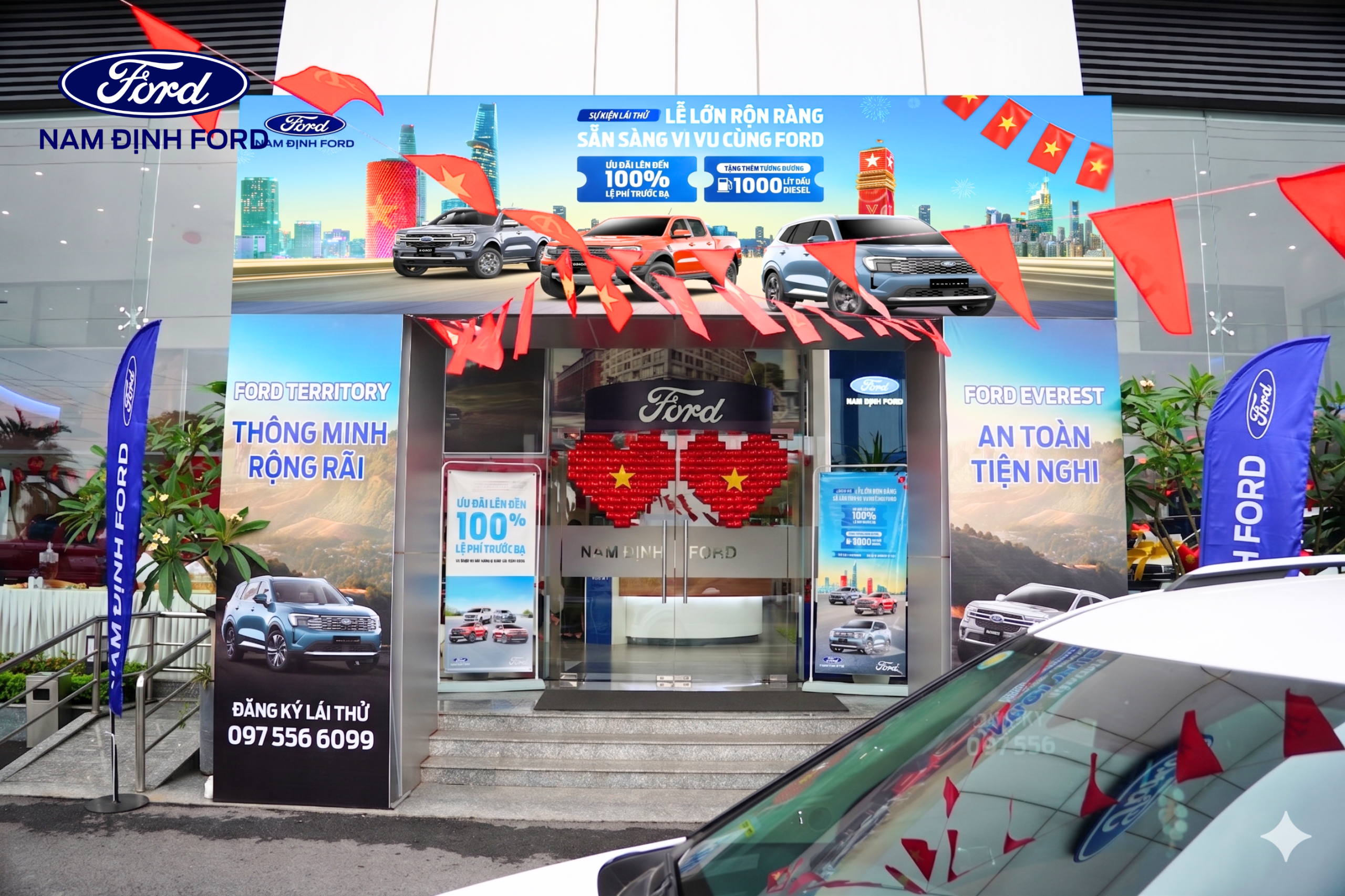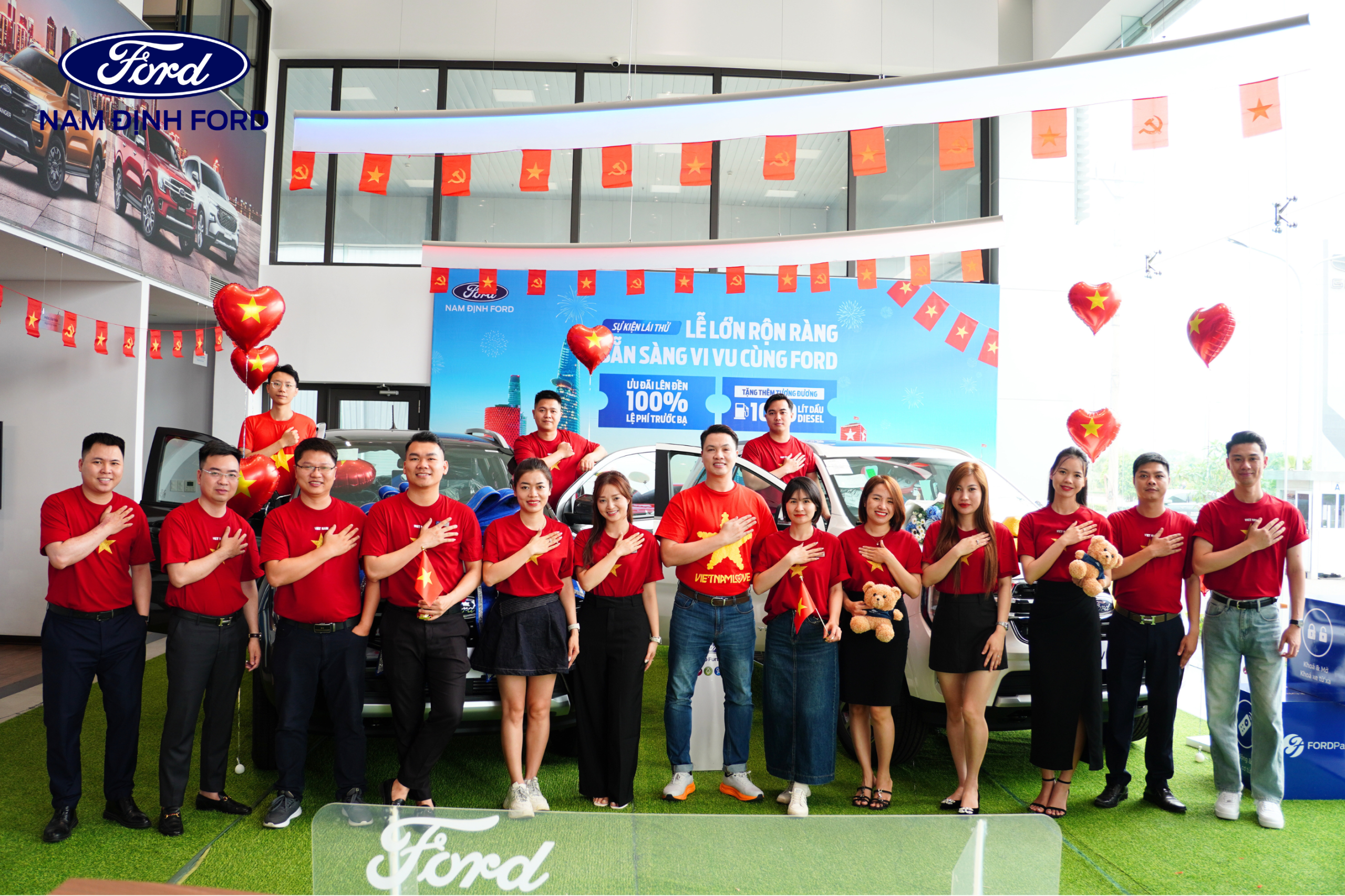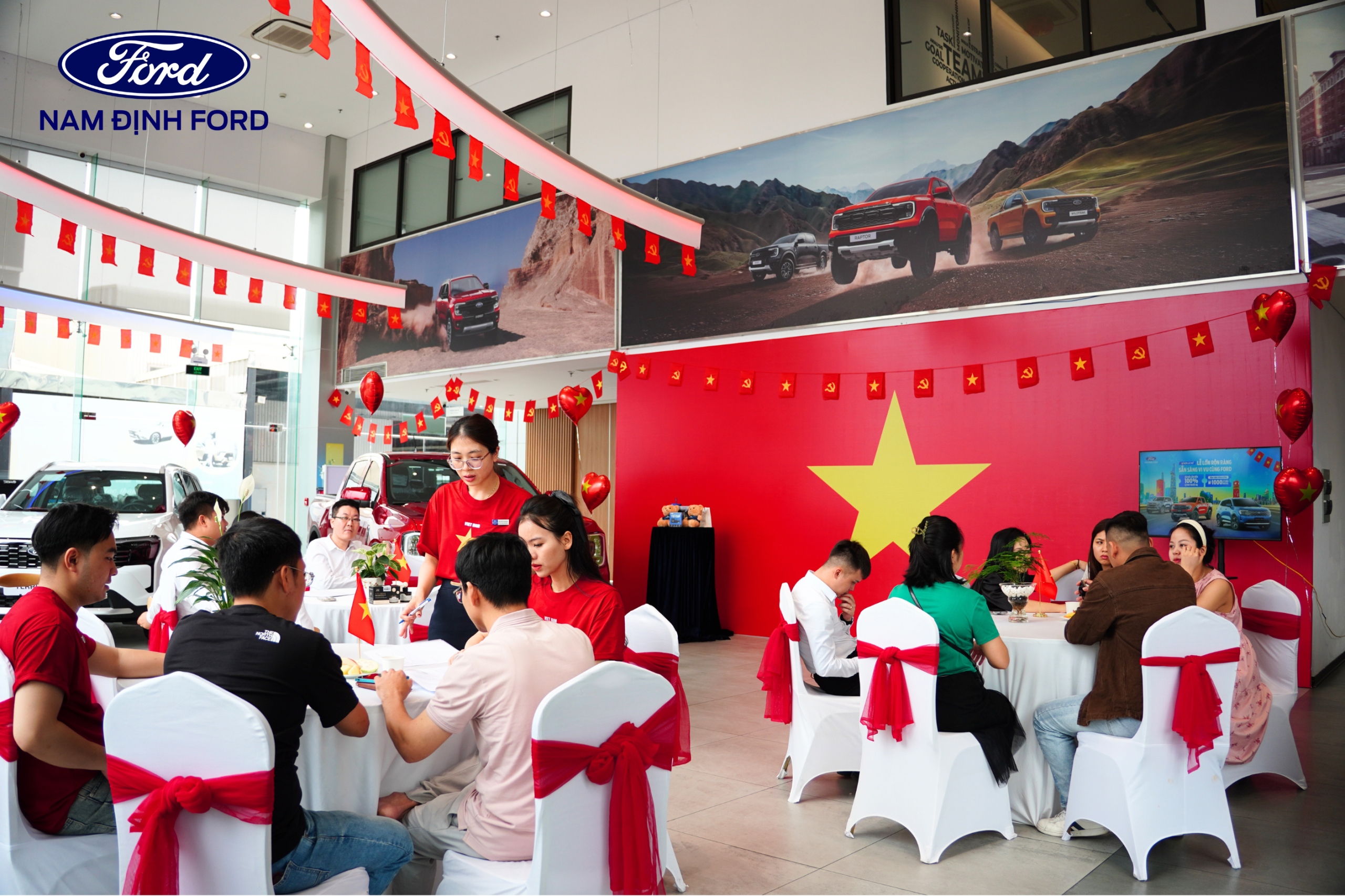 Showroom Nam Định Ford được trang trí nổi bật với sắc đỏ chào mừng đại lễ 30/4, mang đến không gian tươi vui, sôi động.