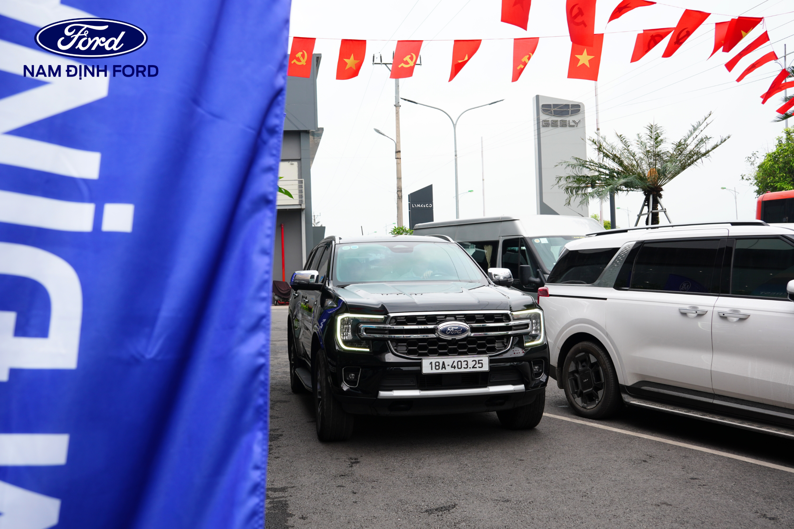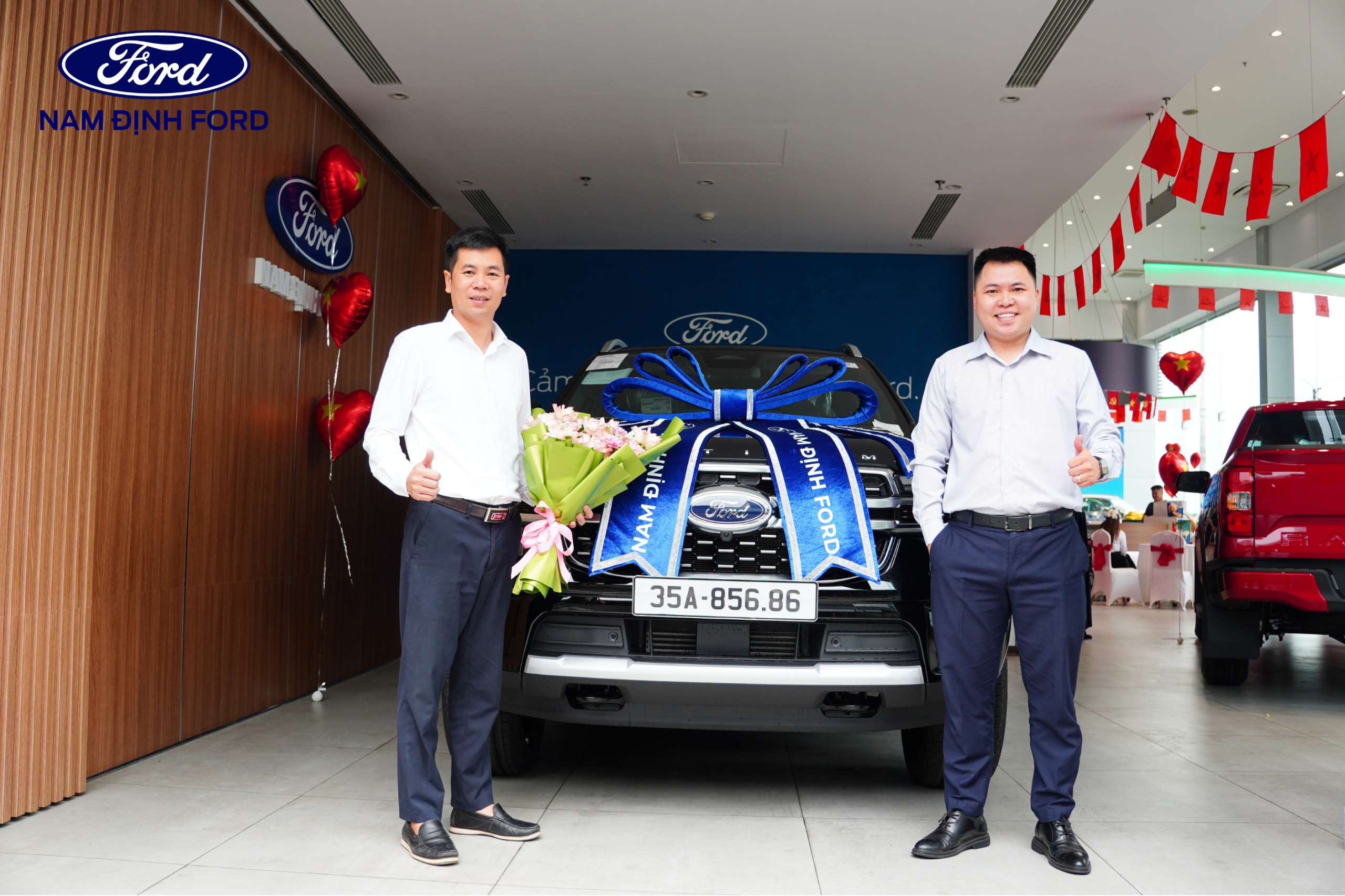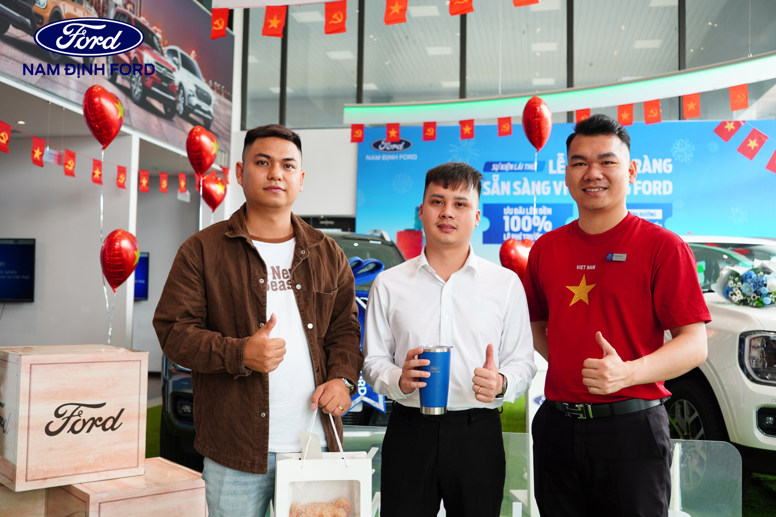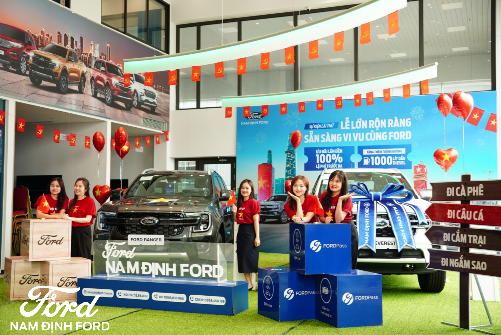 Showroom Nam Định Ford được trang trí nổi bật với sắc đỏ chào mừng đại lễ 30/4, mang đến không gian tươi vui, sôi động.